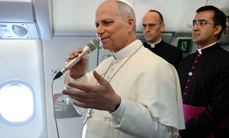 Na letu za Rim, Leon XIV. ponovio je da mu je primarna misija naviještati evanđelje. Sjetio se djece žrtava rata u Iranu i Libanonu. U vezi s migrantima upitao je: „Što Sjever čini za Jug?” i osudio činjenicu da se s ljudima postupa gore nego sa životinjama. Isto tako izrazio je želju da u budućnosti posjeti Latinsku Ameriku, ali je također kazao kako do sada nema nikakvih potvrda glede toga.