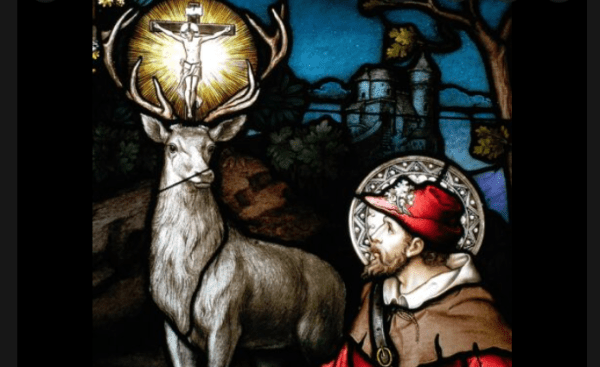 Prije nego što je postao kršćanin, sv. Eustahije zvao se Placid i bio je istaknuti general cara Trajana. Iako poganin, bio je pobožan i milosrdan. Jednoga je dana u lovu naišao na prekrasnog jelena kojega je slijedio šumom sve dok je imao daha, ali ga nije uspio uhvatiti. Potom se jelen popeo na strmu stijenu i odande promatrao svoga progonitelja. No, to više nije bio onaj jelen od prije: između rogova sjajio mu se križ s prikazom raspela. “Zašto me progoniš? – začuo se glas. “Ja sam Isus kojega, i ne znajući, častiš.”